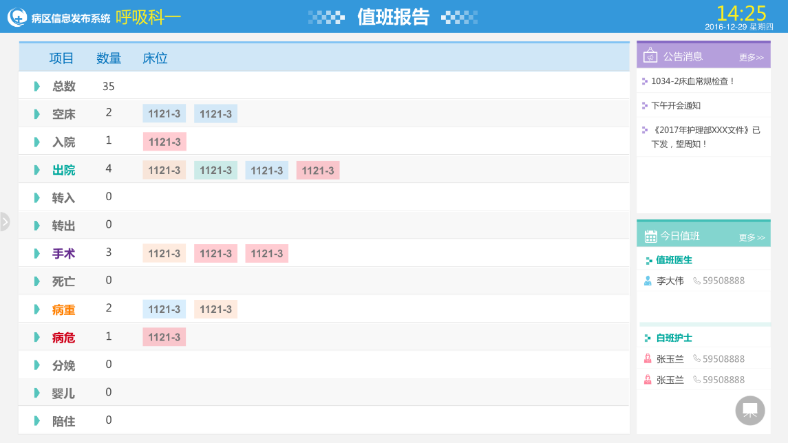 智能統(tǒng)計并展示,今日全員患者值班信息,快速了解病區(qū)情況,包括出入院情況、手術(shù)、病危等數(shù)據(jù)的自動統(tǒng)計。