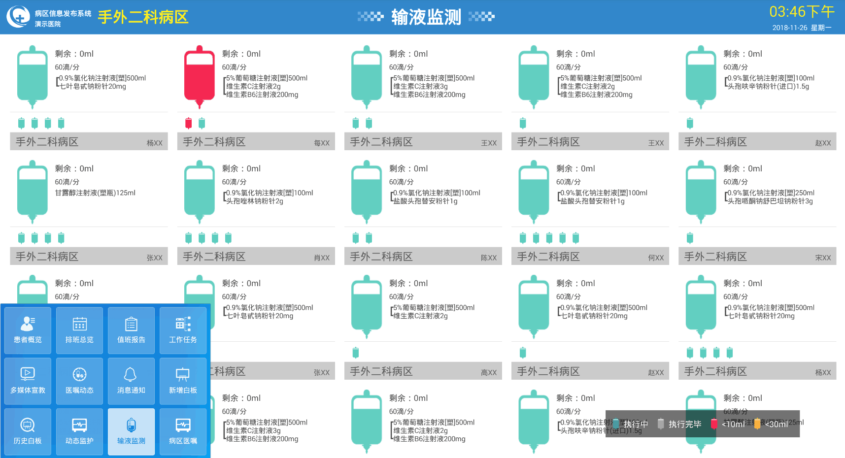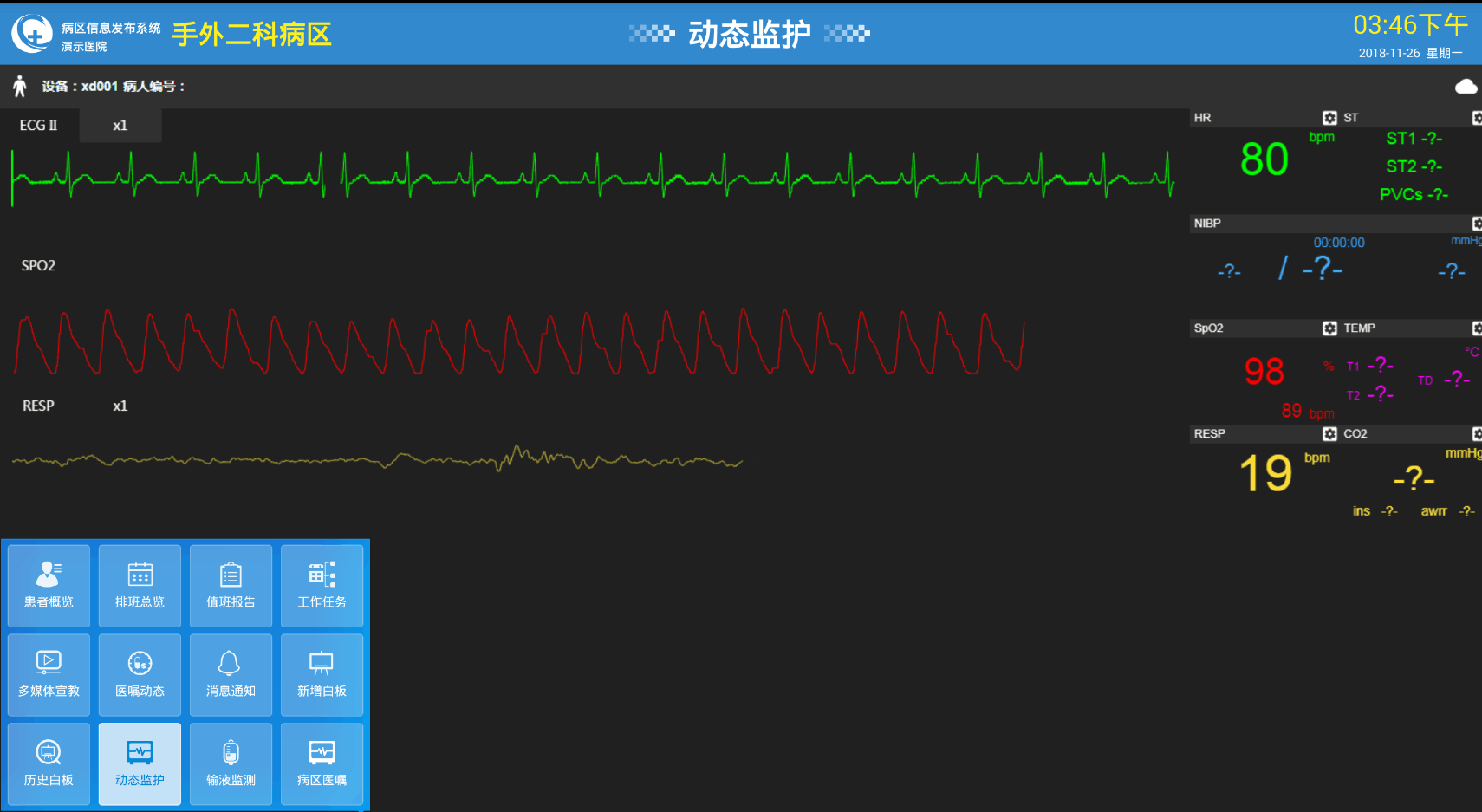 通過對接院內(nèi)物聯(lián)網(wǎng)設(shè)備動態(tài)顯示監(jiān)護(hù)數(shù)據(jù),如心電監(jiān)護(hù)儀、輸液泵、輸液秤等。