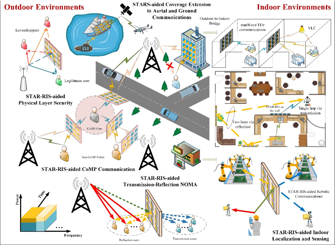 STARS 具有非常廣泛的應(yīng)用場景,比如在 STAR: Simultaneous Transmission and Reflection for 360° Coverage by Intelligent Surfaces 中所列舉的 STARS-NOMA 蜂窩網(wǎng)絡(luò),工業(yè)通信場景,室內(nèi)/室外信號增強(qiáng)以及海上通信等諸多應(yīng)用場景。例如: