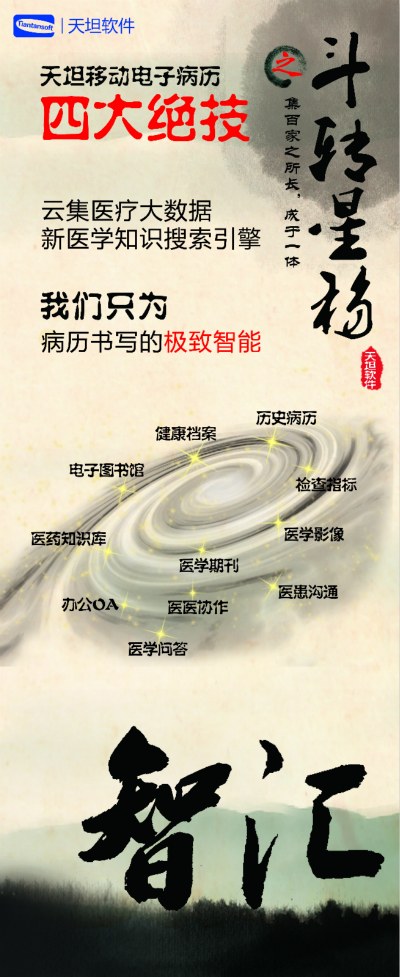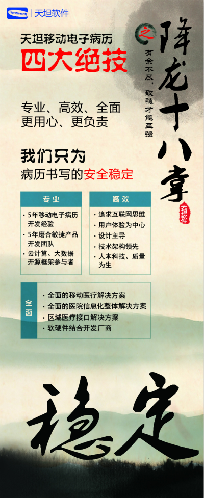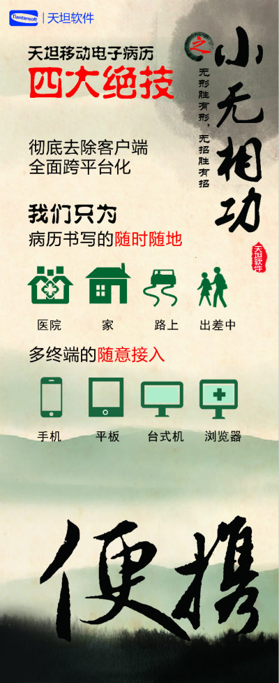 天坦軟件,作為國(guó)內(nèi)移動(dòng)電子病歷的先行者,盛裝亮相京交會(huì)。在會(huì)上展示了以“天坦移動(dòng)電子病歷”為核心的醫(yī)院整體信息化系統(tǒng),受到眾多參觀者的關(guān)注。天坦軟件始終堅(jiān)持以“讓天下沒有難看的病”為宗旨,致力于醫(yī)療事業(yè)發(fā)展。為中國(guó)醫(yī)療衛(wèi)生行業(yè)的信息化建設(shè)以及個(gè)人健康服務(wù)提供從硬件到軟件、從技術(shù)到服務(wù)的全面解決方案,是中國(guó)醫(yī)療信息化市場(chǎng)中快速成長(zhǎng)的獨(dú)立軟件廠商之一。數(shù)年來,一直堅(jiān)持研發(fā)以移動(dòng)電子病歷為核心的醫(yī)院信息化系統(tǒng),從移動(dòng)框架的病歷編輯器到跨平臺(tái)的移動(dòng)醫(yī)療解決方案,為整個(gè)病歷信息化行業(yè)注入了極強(qiáng)的創(chuàng)新活力。 “天坦移動(dòng)電子病歷”為核心的醫(yī)院整體信息化系統(tǒng)秉承“高效應(yīng)用、信息互通”的基本理念,是專門為醫(yī)院設(shè)計(jì)開發(fā)的醫(yī)療信息化系統(tǒng)的核心組成部分。具有高效、安全、穩(wěn)定、易用、移動(dòng)、智能等特點(diǎn),除此之外,還具有穩(wěn)定、完全跨平臺(tái)運(yùn)行、功能強(qiáng)大、系統(tǒng)性能卓越等巨大優(yōu)勢(shì)。