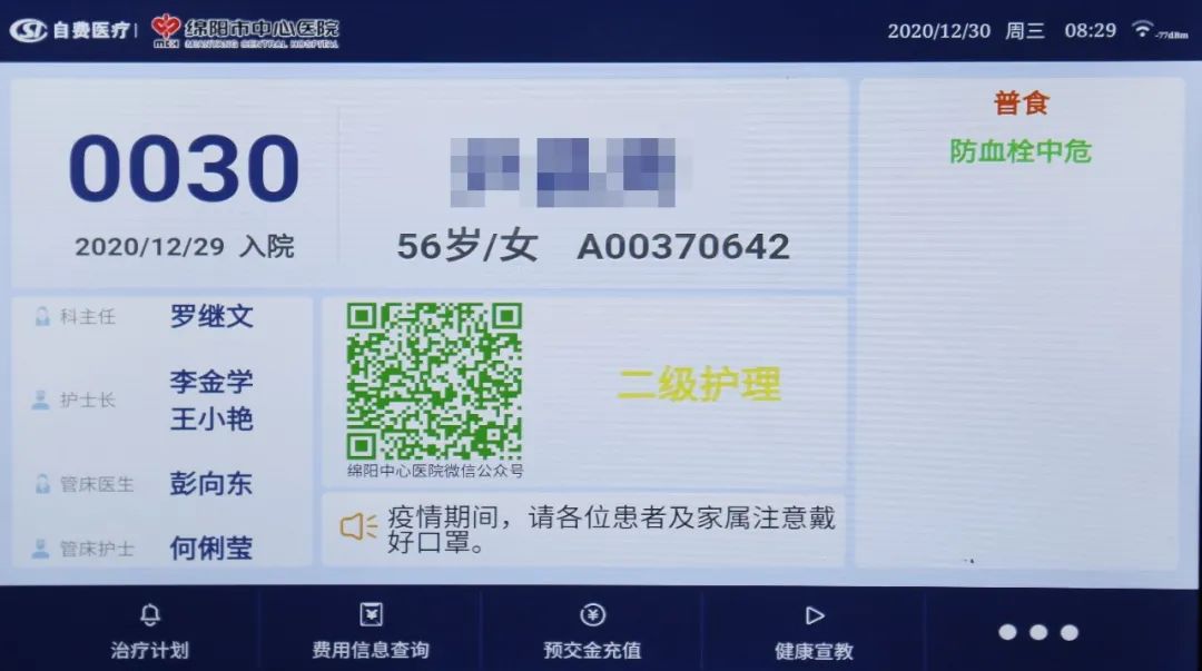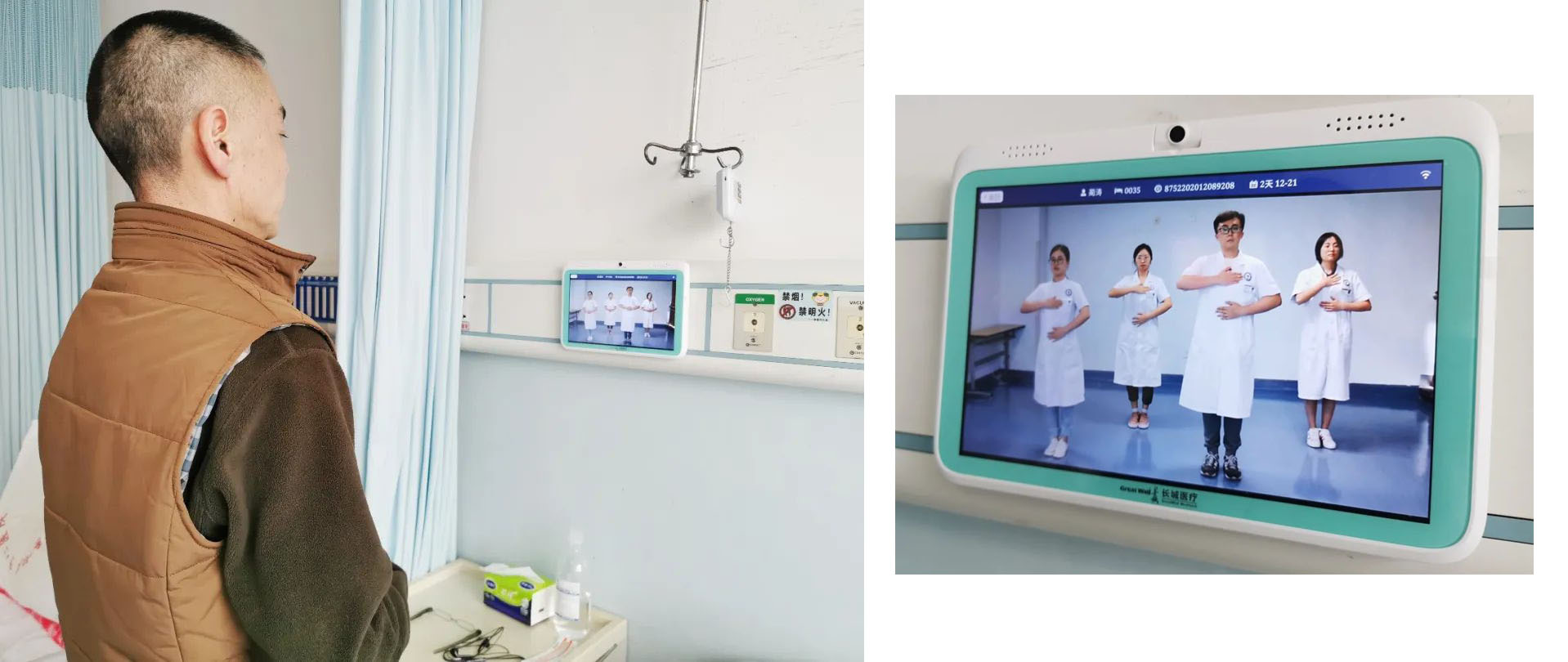 在市中心醫(yī)院心胸外科病房,剛?cè)朐旱牧质迨逭龑χ〈泊差^的電子屏幕跟著醫(yī)護(hù)人員一起做呼吸訓(xùn)練操……林叔叔因肺部結(jié)節(jié)入院準(zhǔn)備手術(shù),術(shù)前術(shù)后的呼吸訓(xùn)練能幫助他快速康復(fù),“以前我們會把患者集中組織起來教他們做呼吸訓(xùn)練操,但是可能學(xué)一次就忘了,現(xiàn)在我們把這些健教視頻放在患者床頭的電子屏上,患者可隨時可以點進(jìn)去跟著練習(xí),”護(hù)士長李金學(xué)介紹,“除此之外,林叔叔還可以通過這塊屏幕實現(xiàn)診療計劃查詢、床旁掃碼繳費(fèi)、費(fèi)用明細(xì)查詢……以后我們還想利用這套信息系統(tǒng)完成床旁結(jié)算,患者從住院到出院,在病房就能一站式完成。”